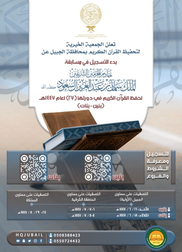 ✨ فرصة مباركة لأهل القرآن يسرّنا الإعلان عن بدء التسجيل في مسابقة الملك سلمان لحفظ القرآن الكريم لعام 1447هـ